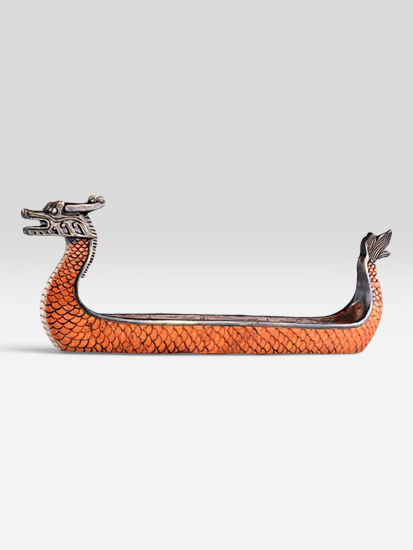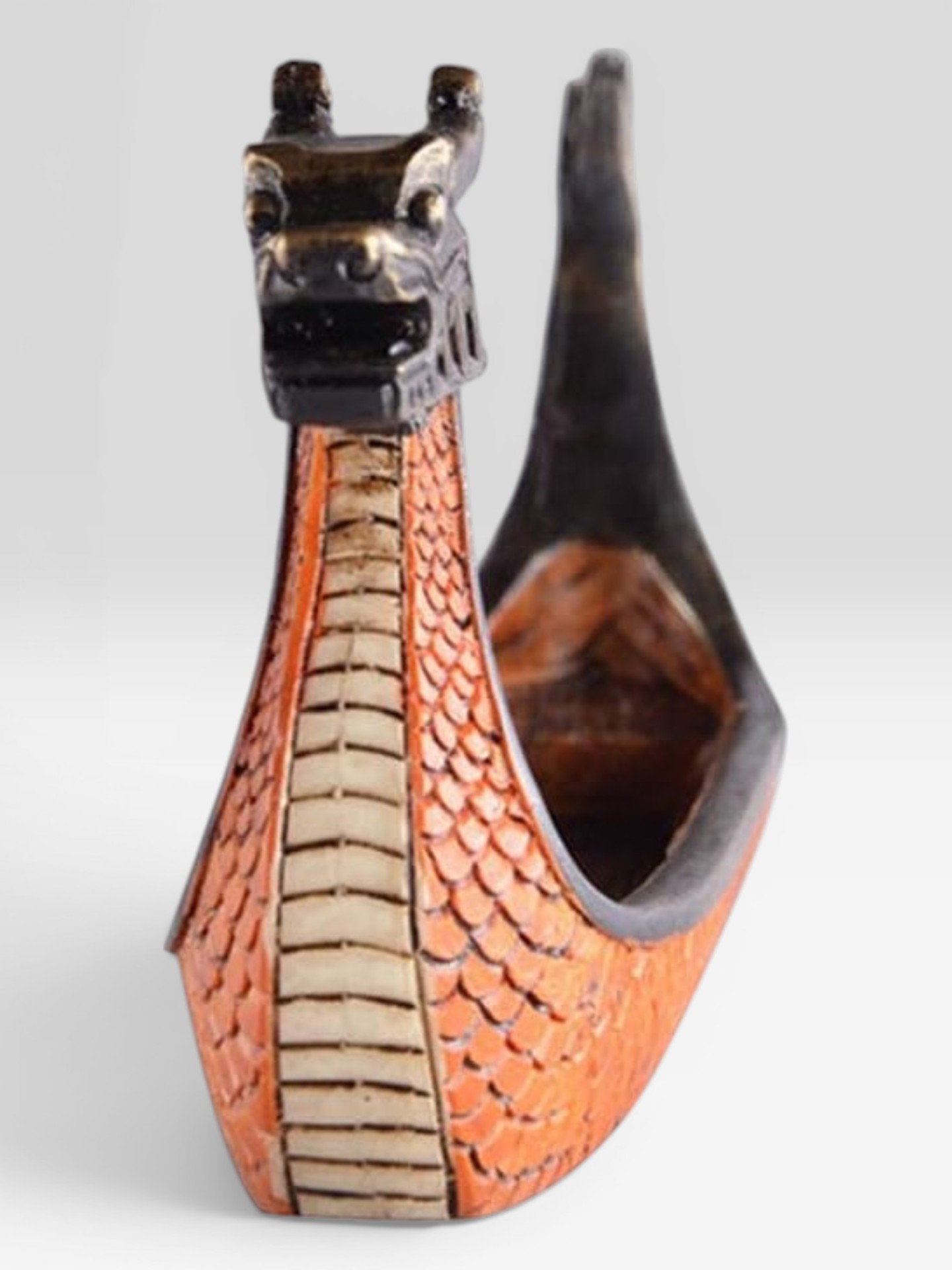 Uzak Doğu estetiğini yaşam alanına taşıyan bu ejderha kayık tütsülük, sadece bir aksesuar değil, bulunduğu ortama karakter kazandıran güçlü bir dekor parçası. Geleneksel Çin ejderha formundan ilham alan tasarımı, kabartmalı yüzeyi ve retro dokusuyla ilk bakışta dikkat çeker. Kayık formu boyunca uzanan ejderha detayı, ürüne hem mistik hem de zamansız bir hava katar.